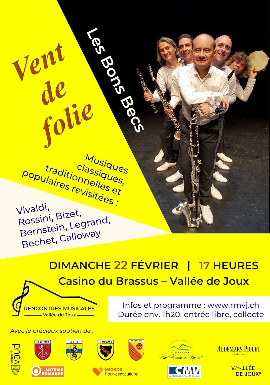 Avec le spectacle Vent de folie, Les Bons Becs, fidèles à leur tradition, revisitent les répertoires de la musique classique, des musiques traditionnelles et populaires. Parfois facétieux et parfois danseurs, mais toujours musiciens, Les Bons Becs ne cessent de surprendre par leur façon d’interpréter la musique.